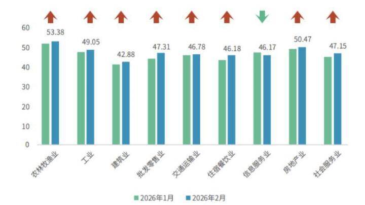 分职业来看,2月,九大职业运营景气量指数呈8升1降。2月份,全国规划以上工业增加值比1月增加0.83%,工业生产加速。新年年货收购、礼品消费等需求旺盛,影响了农林牧渔业和批发零售业等职业销售额继续提高,物流货运需求也维持在较高水准。叠加节前返乡和节后返岗人员活动量大,带动了客运相关的收入。修理、养老、美容、文娱等社会服务业消费同步旺盛。团圆宴、朋友聚餐以及假日旅行热潮,带动了住宿餐饮业营收增加。2月份,全国固定财物出资(不含农户)环比增加0.39%,要点出资项目连续开工,全国多地房地产支撑方针密布落地、精准发力,从优化限购、上调公积金额度到发放购房补助,一系列行动继续激活商场生机,建筑业和房地产业运营景气量改进。信息服务业运营景气量会下降。
